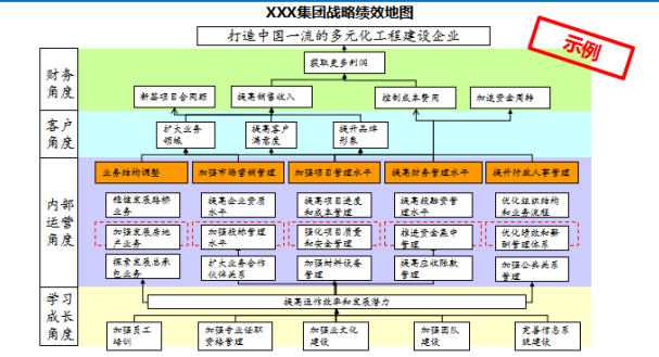 该集团意图打造中国一流的多元化工程建设企业为愿景目标,为此,在财务层面,要求获得更多的利润,我们可以分别从利润、收入、周转、费用角度去解释。在客户层面,要扩大业务领域、提高满意度、提升品牌形象;为此在内部运营层面,包括要推动业务结构调整、加强市场管理等。针对每一部分进行关键主题解释,我们可以详细设置出每个环节应完成的各项具体目标。公司层面指标确定后,进一步明确各项指标的主要负责部门。需要注意的是,企业里大量的指标并非一个部门能够完成的,这就需要依据各部门与指标之间的相关性,进行合理分配。比如,工程结算率,如果仅仅考核成本管理部门,那么我相信在这个企业里边,肯定做不好结算。但反过来,我们根据结算工作与不同部门间的相关性,比如合理的将其分配到成本、工程、质量、项目、以部之间,通过考核权重的不同引导这些关键部门关注结算工作。使结算在公司内部形成一条完整的业务链条,而非全部抛给一个部门,结果就是这个部门挑了一个又不是靠他自己就能完全掌控的工作,他又不能指挥同级部门,结果可想而知。当然,也有的企业会说,我通过部门间的满意度来约束相关部门的工作。这种方案是不是合适呢?我的观点是不合适。满意度是一个综合概念,是杂七杂八事情的汇总,结算是工程企业的一大关键任务,把一个涉及到企业生命的关键要素放到一个模棱两可的满意度维度下进行考核,显然不合理。